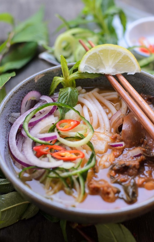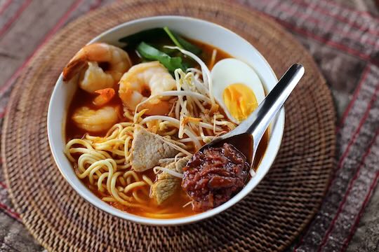 Asam laksa is a sour and spicy noodle soup made with fish broth, tamarind, herbs, and mint. It has a bold flavor that many international visitors remember long after their trip.