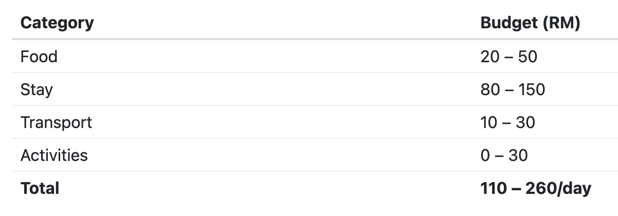 - 🍜 Street food (Char Kway Teow, Laksa): RM6 – RM12
